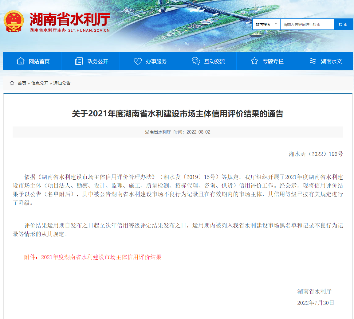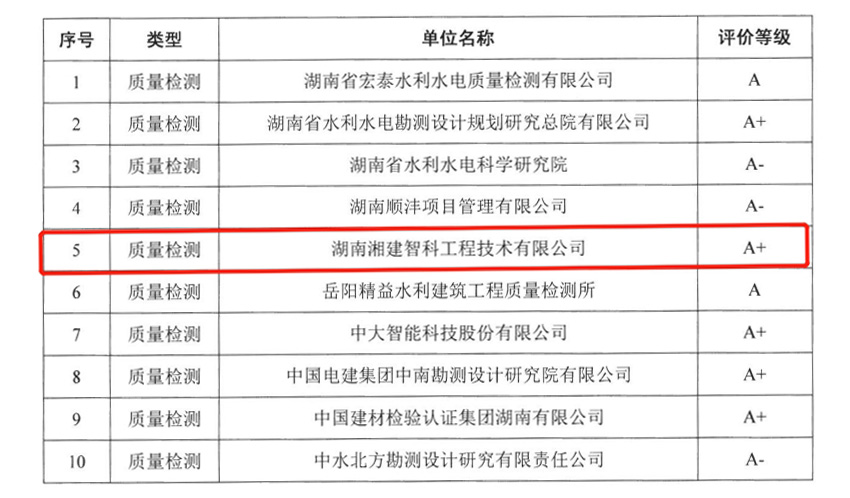 8月(yuè)(yuè)2日,湖南(nán)省水利廳官網公布《2021為數年度湖南(nán)省水利建設市(shì)場(chǎng去微)主體(tǐ)信用評價》結果,湖南(nán)湘建智科工程業道技術有限公司(以下(xià)簡稱湘建智科)榮獲質量檢測類A+級信用等級。