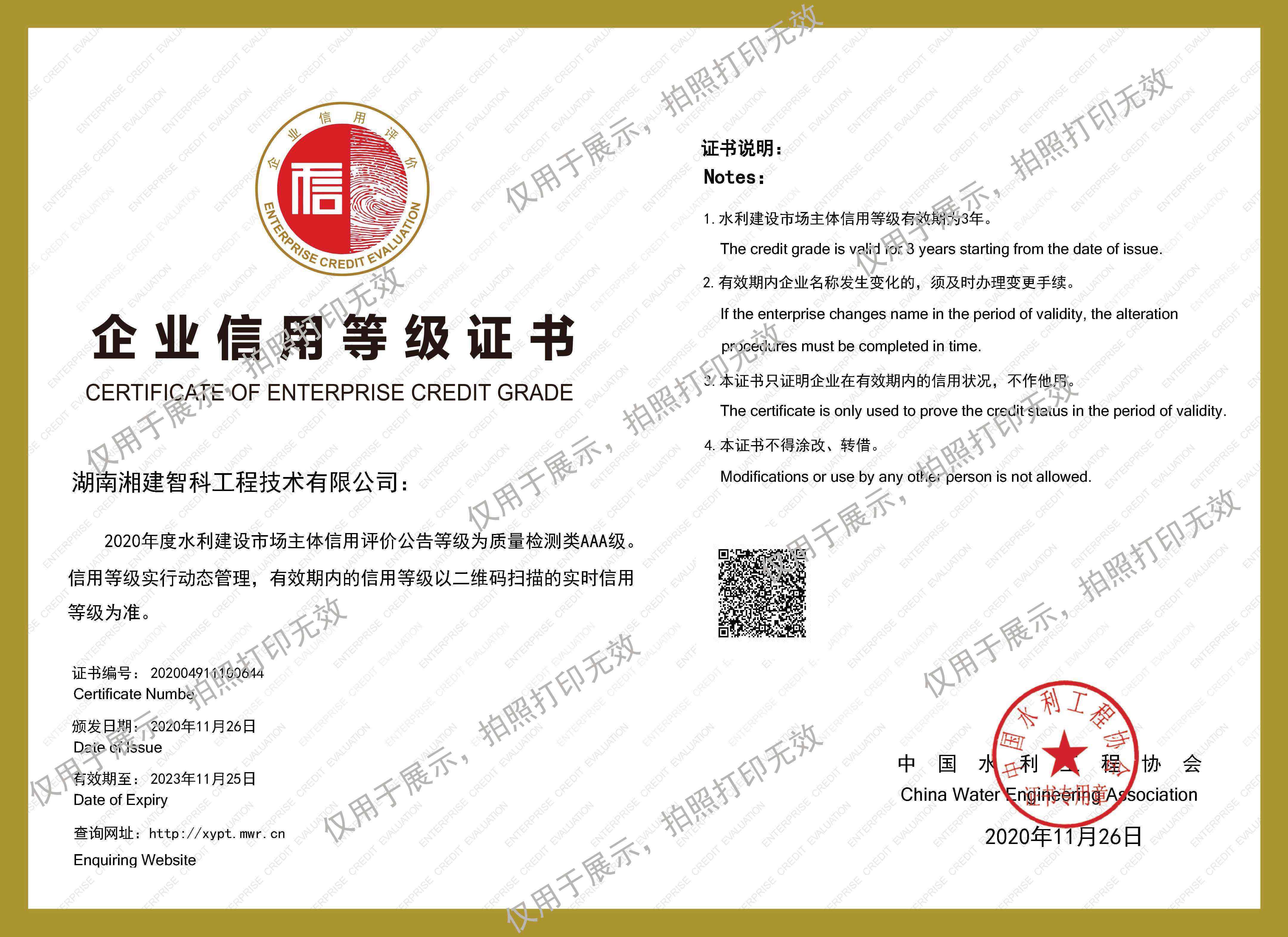 同時(shí),在2020年,湘建智科已經榮獲中國水利工程協會頒發的《2020年度水利建設市(shì)場(chǎng)主體(tǐ就中)信用評價》質量檢類AAA級信用等級(最高等級)。此次獲得湖南(nán)省水利建設市(輛子shì)場(chǎng)主體(tǐ)信用評價A+級,實至名歸!