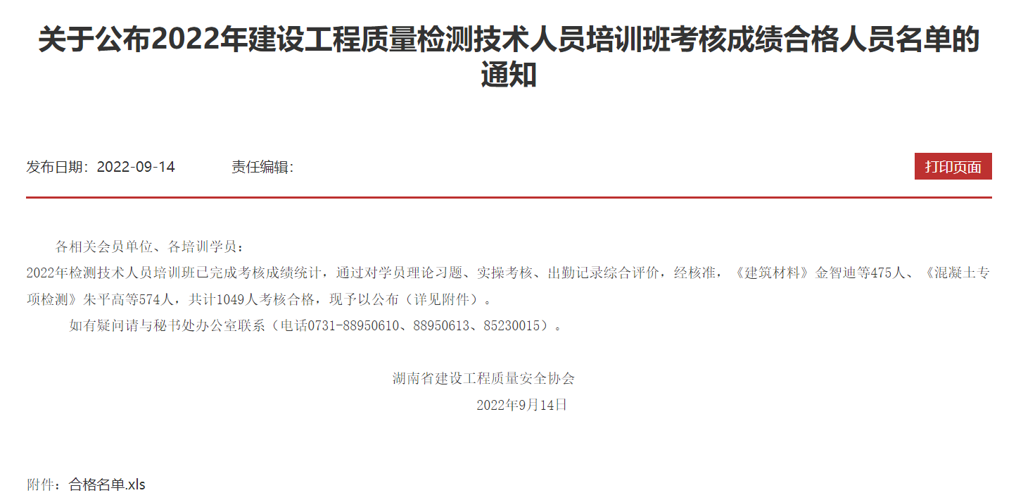 根據湖南(nán)省建設工程質量安全協會消息,2022年建設工程質量土厭檢測技術人(rén)員(yuán)培訓班考核成績合格人(rén)員(yuán了這)名單已經發布,湘建智科總部及分(fēn對能)公司共計15人(rén)通過考核。