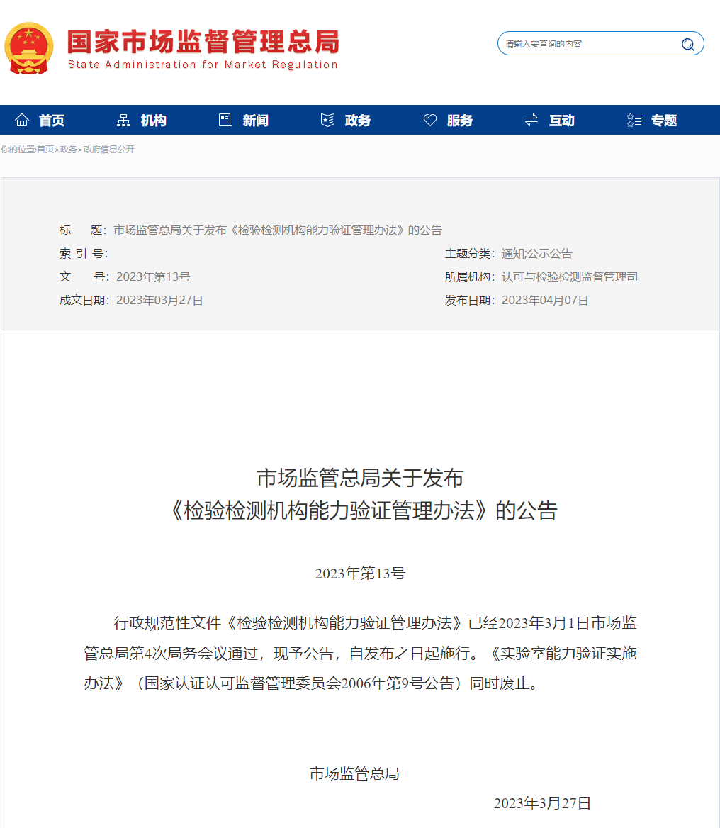 重磅!《檢驗檢測機構能(néng)力驗證管理(lǐ)辦法》全文費個發布