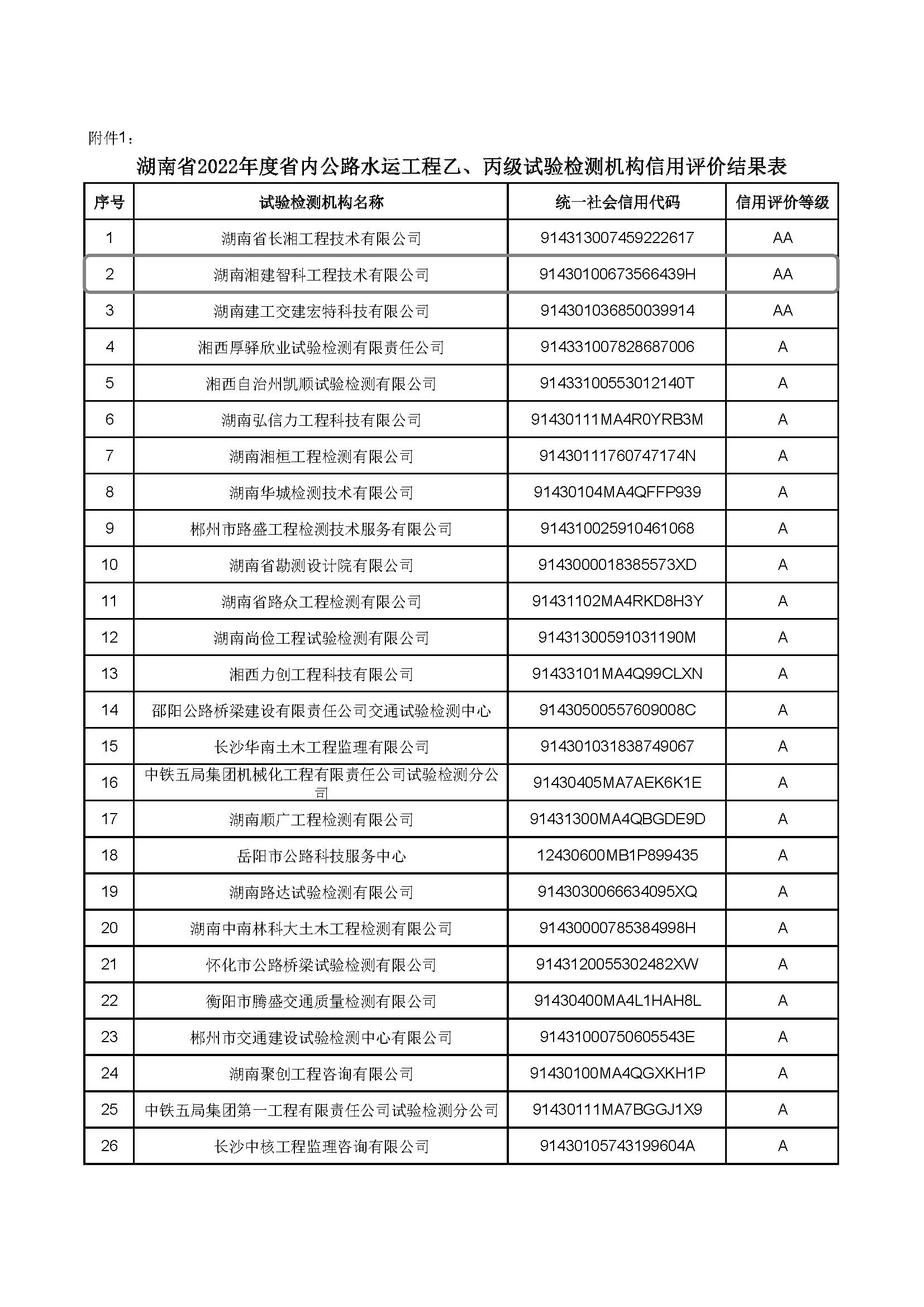 喜訊|湘建智科榮獲湖南(nán)省公路(lù)水運工程試個鄉驗檢測AA級信用評價
