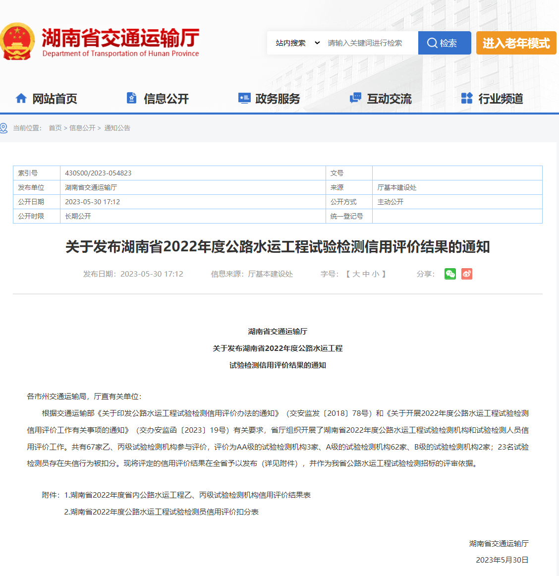 湖南(nán)省2022年度公路(lù)水運工程試驗檢測信用評價